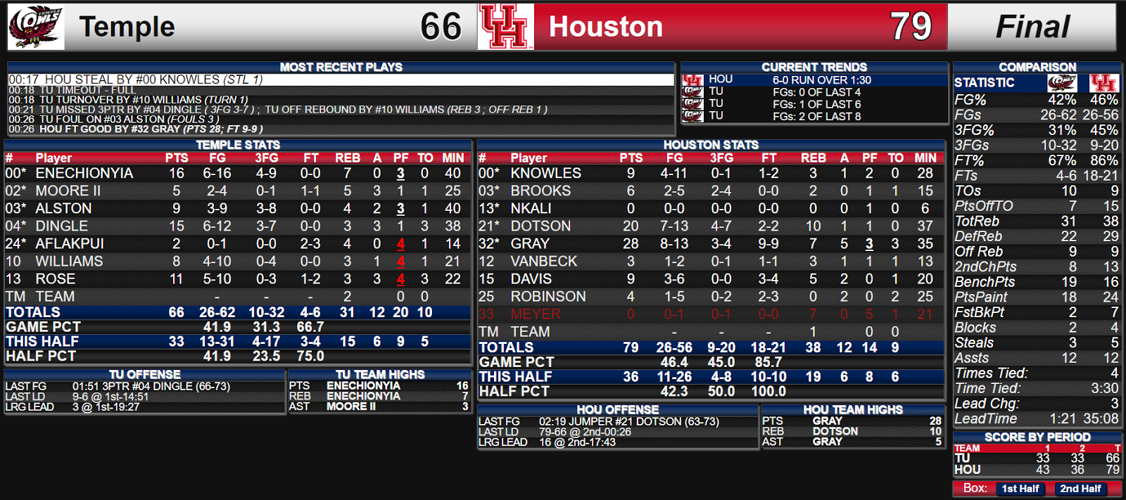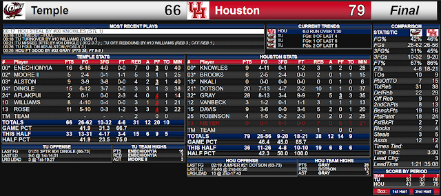 HOUSTON, TX (Hofheinz Pavilion) -- The Houston Cougars topped the Temple Owls late Saturday night 79-66.