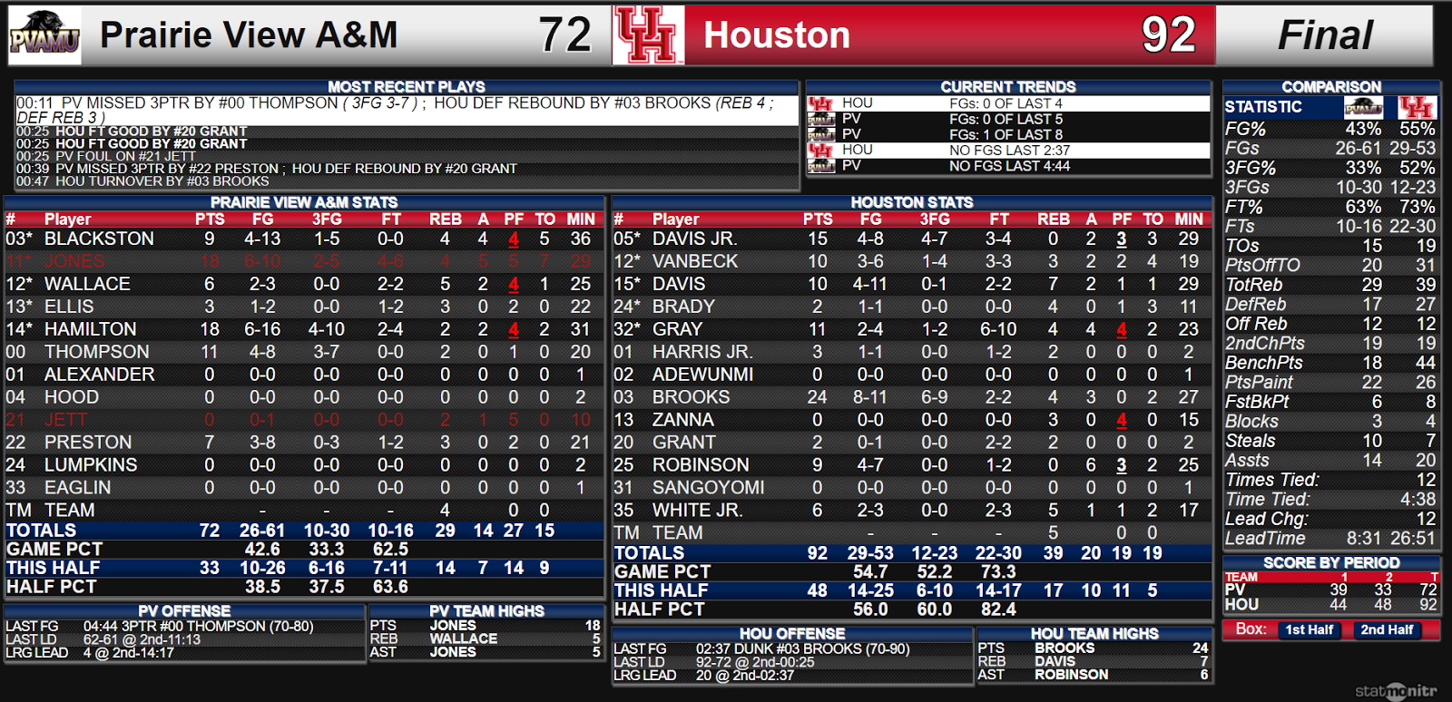 Final stats: Houston Cougars 92, Prairie View A&M Panthers 72 |