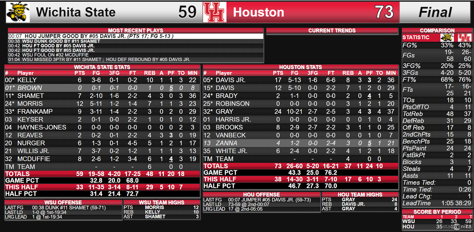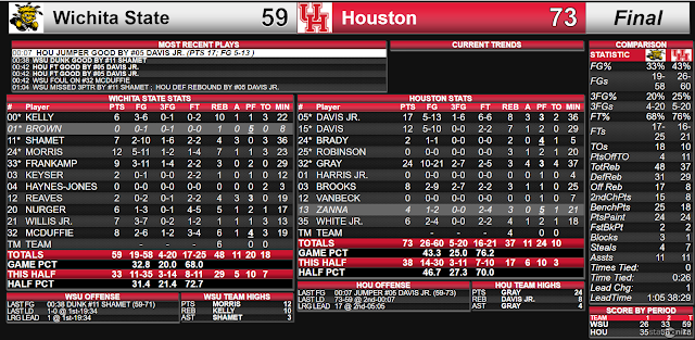 Houston senior guard Rob Gray scored a game-24 points. Gray's back court mate, junior Corey Davis Jr., scored 17 points; and, senior Devin Davis scored 10 points.