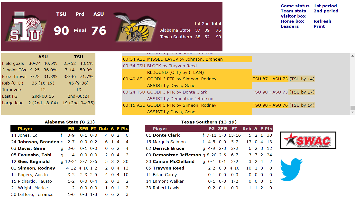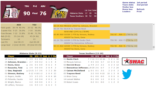 Texas Southern kept Alabama State at arms' length the remainder of the game. The Tigers' lead fluctuated between 12 and 19 points.