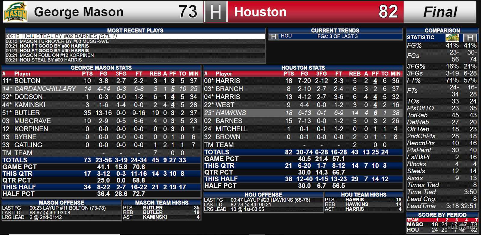 Butler dominated the Coogs in the first half with 26 points (11 for 13 field goals) and 12 rebounds. Houston had no answer for Butler in the first 20 minutes.
