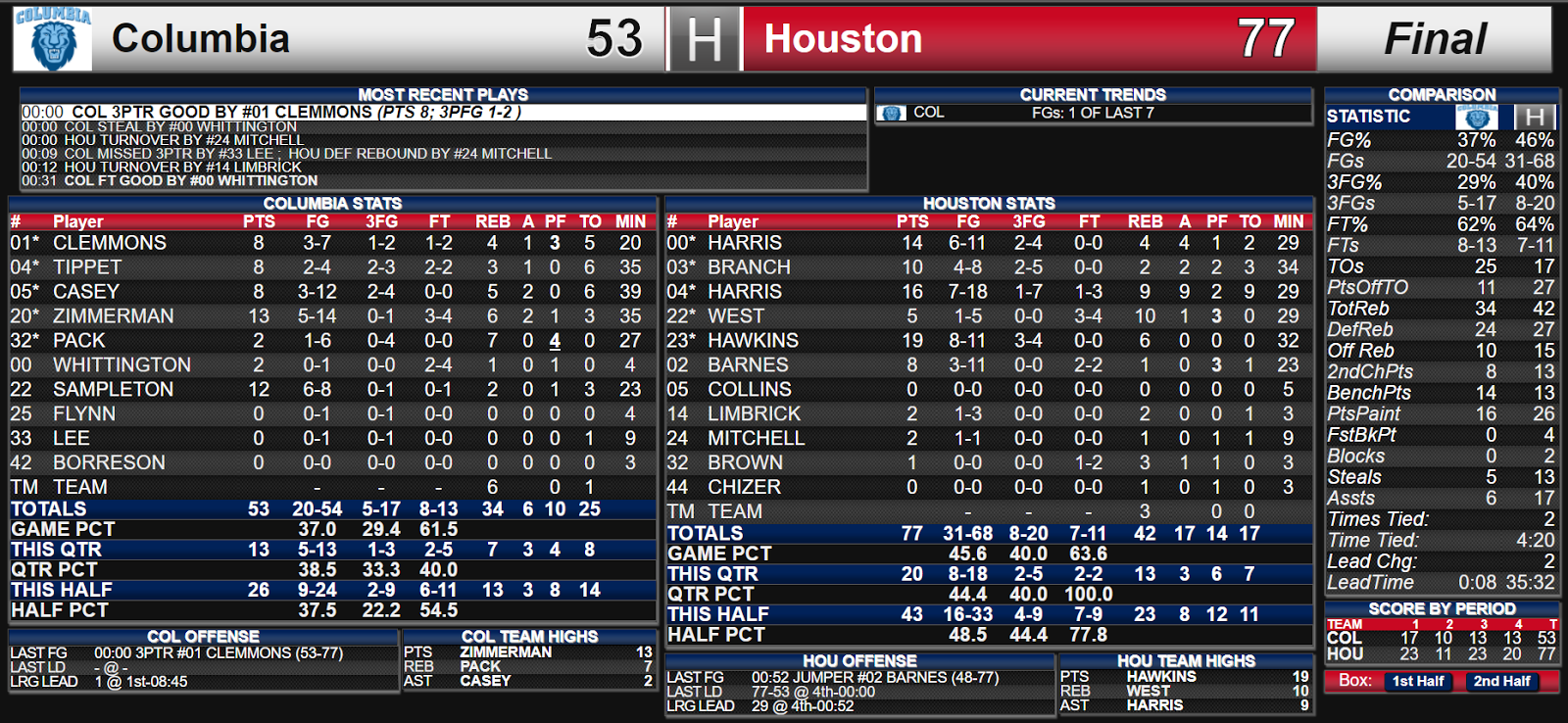 Houston continued the pressure defense and Columbia turned over the ball 8 more times in the final quarter which led to 12 points by Houston. Houston committed 7 turnovers in the fourth period but many of them were unforced turnovers.
