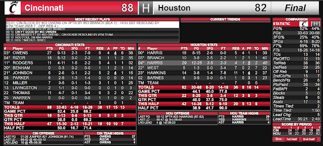 With the loss, Houston's record falls to 14-4 overall and 3-1 in the American Athletic Conference. Cincinnati's record improves to 10-7 overall and 2-2 in the AAC.