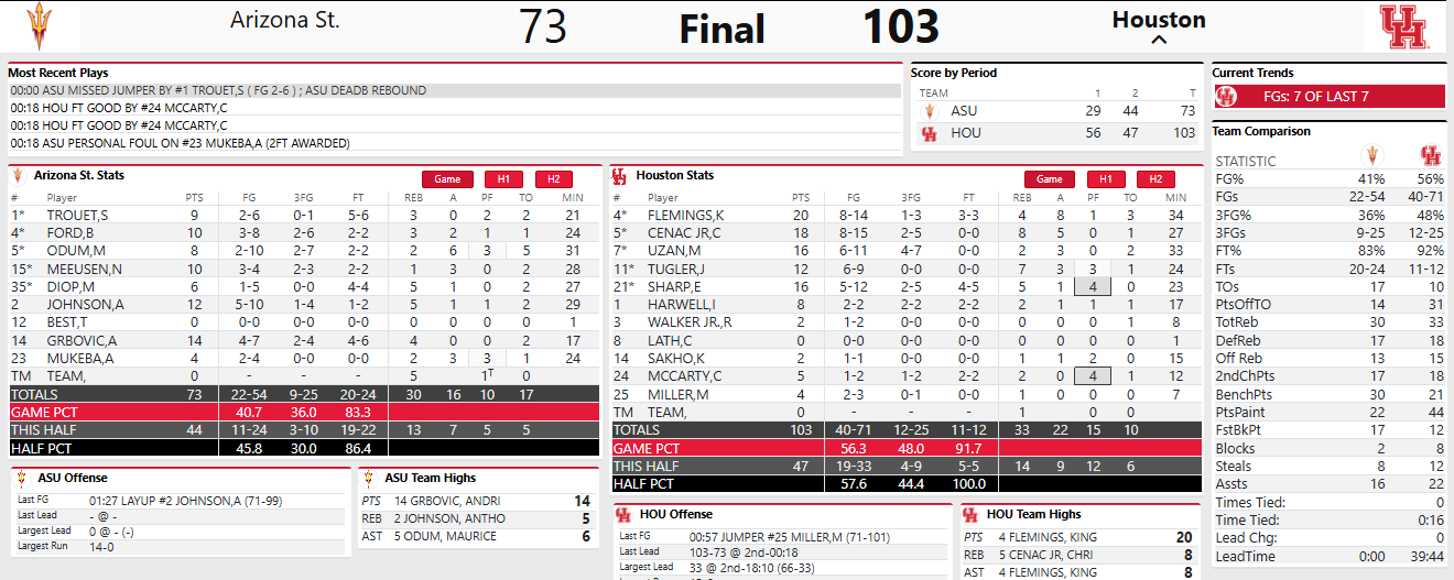 Houston missed shots, turned over the ball, and had a few lapses on defenses which Arizona State took advantage of with a 12-0 run to pull within 13 (79-66) with 7:31 remaining in the 2nd half.