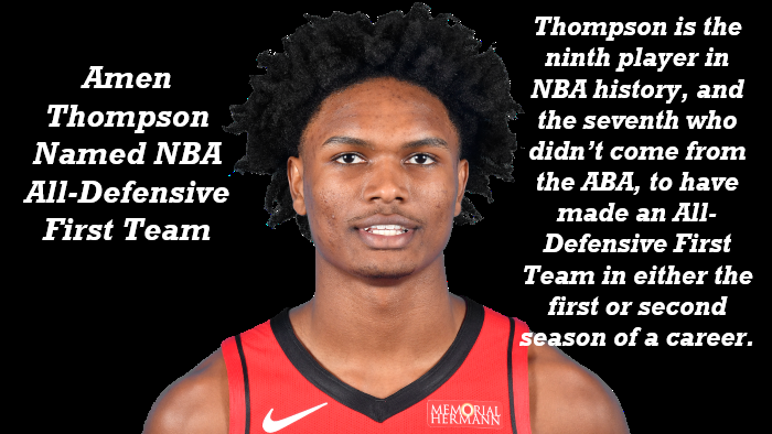 Today, the NBA announced that Houston Rockets guard/forward Amen Thompson was named NBA All-Defensive First Team. He is the fifth different player in franchise history to have been selected to an All-Defensive First Team (Hakeem Olajuwon 5 times, Rodney McCray, Scottie Pippen, Patrick Beverley).
