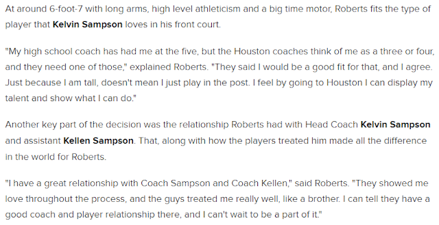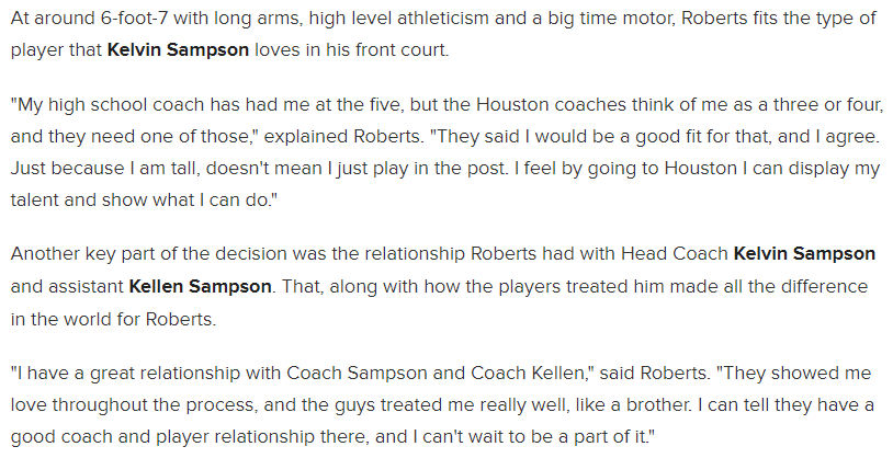 Brian Snow of 247Sports, 'At around 6-foot-7 with long arms, high level athleticism and a big time motor, Roberts fits the type of player that Kelvin Sampson loves in his front court.'