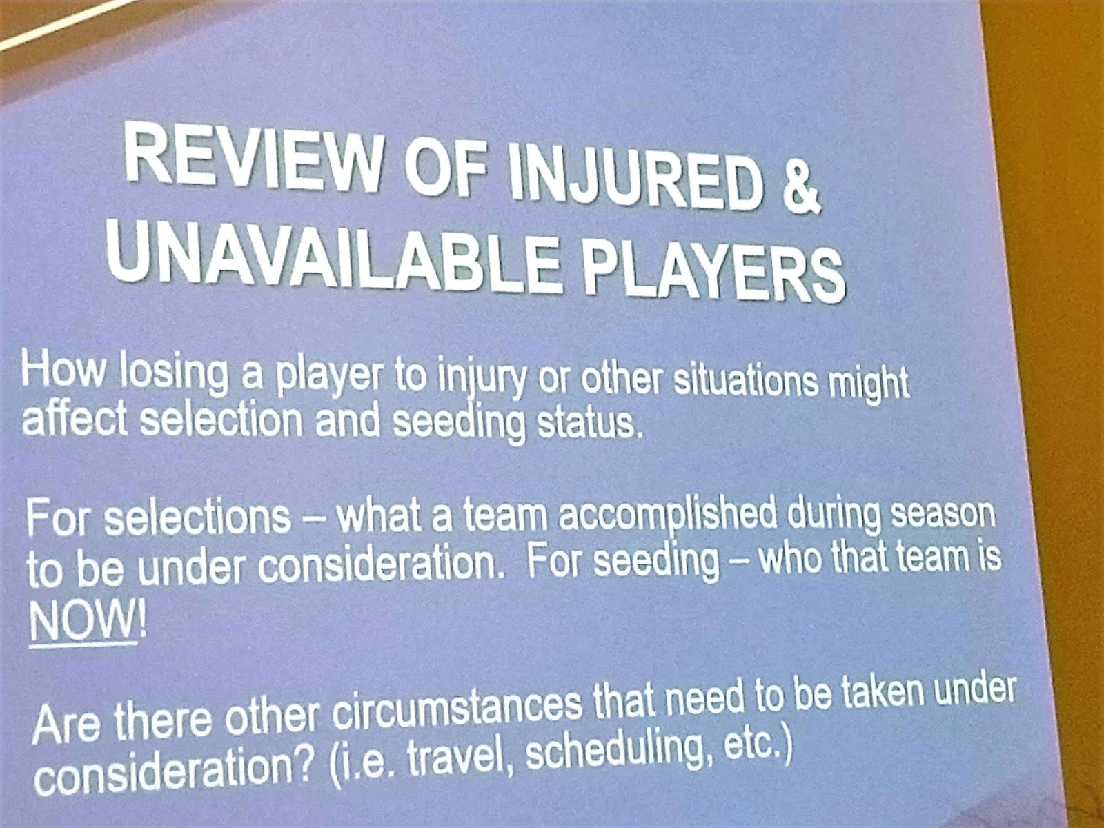 Next, the NCAA presented a slide which hopefully answers a question that pops up every year: How does the Committee handle situations involving injured and / or unavailable players?