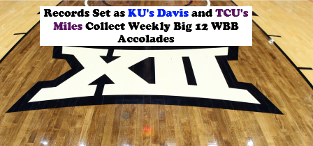 TCU's Olivia Miles (player) and Kansas' Jaliya Davis (freshman) obtained Big 12 women's basketball weekly awards for the 15th week of the 2025-26 season. Davis is the first player in league history to win Freshman of the Week seven consecutive times.